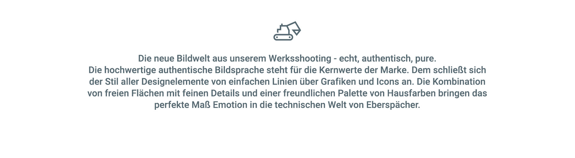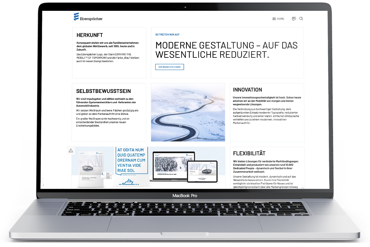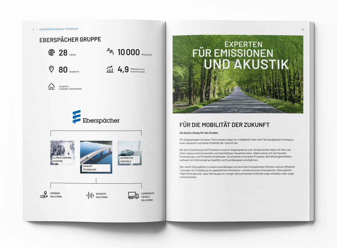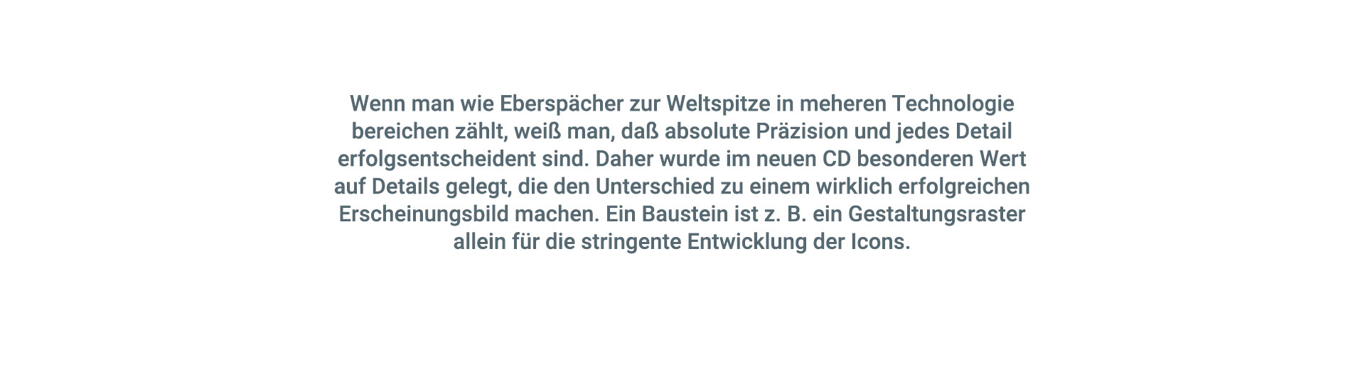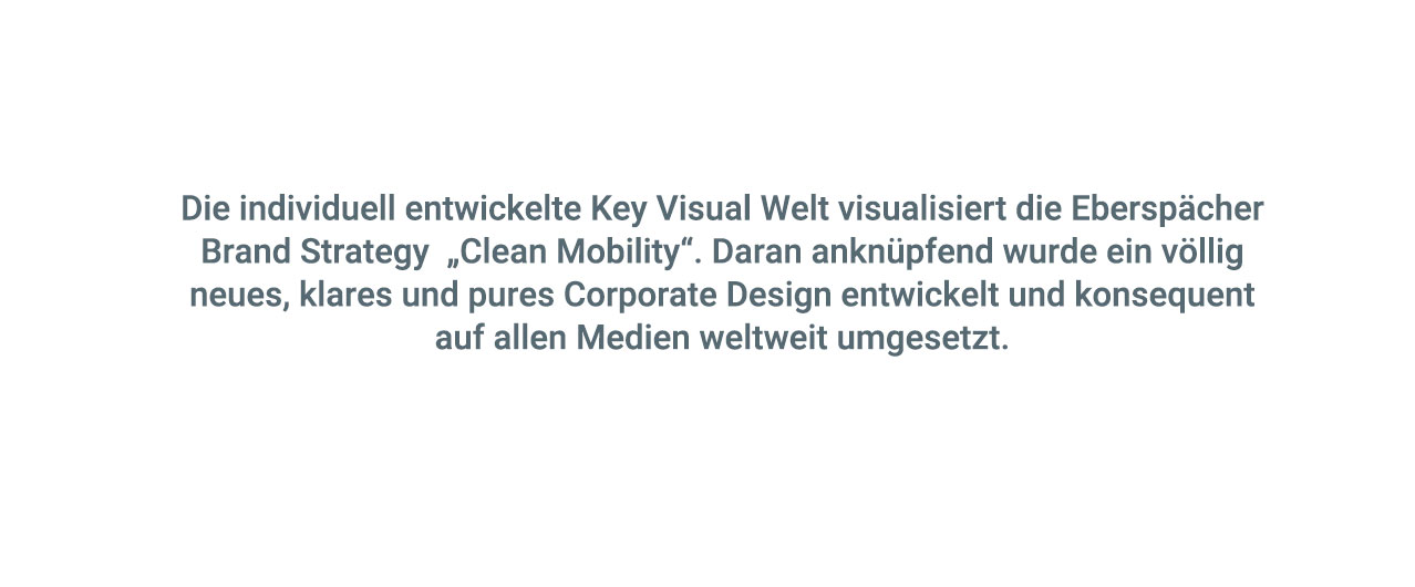 Die Eberspächer Gruppe zählt weltweit zu den führenden Systementwicklern und -lieferanten für Abgastechnik, Fahrzeugheizungen und -elektronik sowie Klimasystemen mit mehr als 10.000 Mitarbeiter weltweit. Im Fokus der zukünftigen Unternehmensstrategie liegen dabei das Thema Clean Mobility und Pure Emissions. Unsere Aufgabe? Mit welchem neuen Corporate Design muss die Eberspächer Gruppe zukünftig am Markt auftreten, die diese Strategie trägt, unterstützt und überzeugend visualisiert.