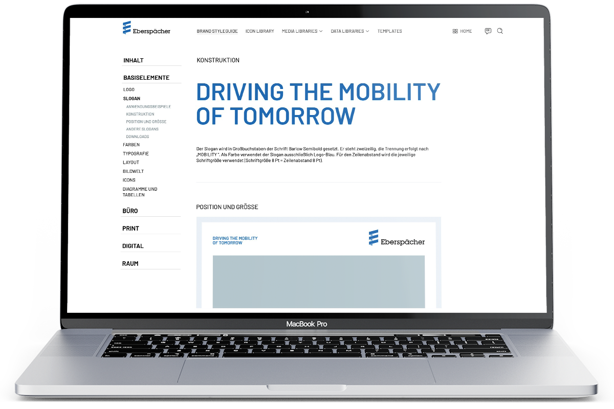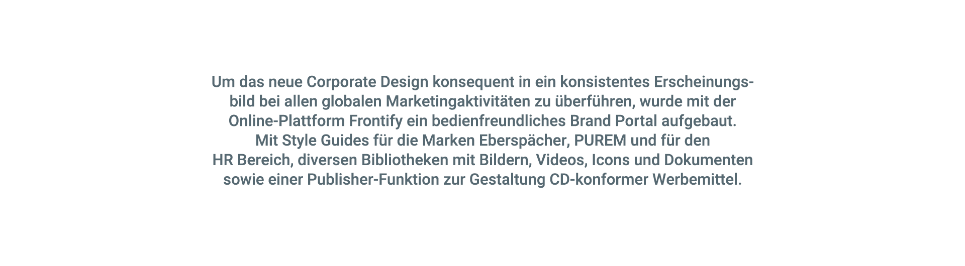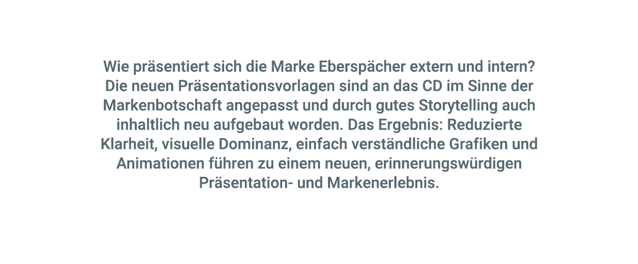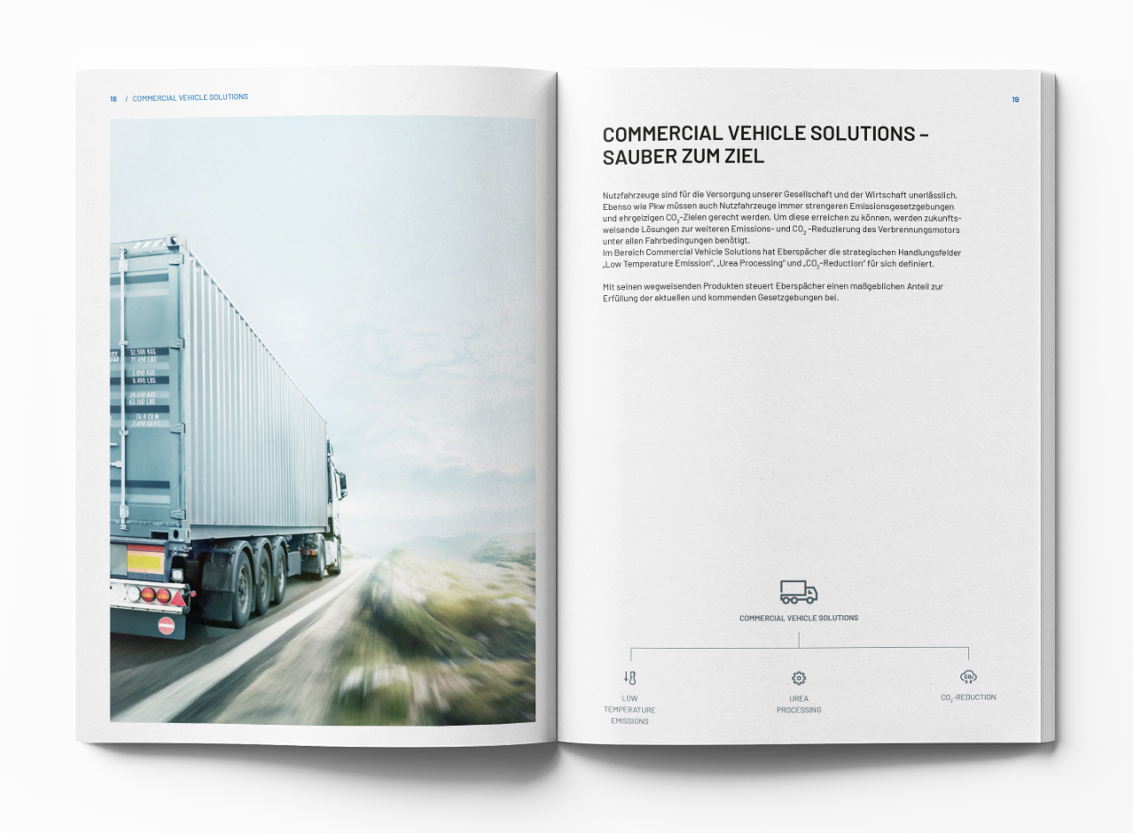 Die Eberspächer Gruppe zählt weltweit zu den führenden Systementwicklern und -lieferanten für Abgastechnik, Fahrzeugheizungen und -elektronik sowie Klimasystemen mit mehr als 10.000 Mitarbeiter weltweit. Im Fokus der zukünftigen Unternehmensstrategie liegen dabei das Thema Clean Mobility und Pure Emissions. Unsere Aufgabe? Mit welchem neuen Corporate Design muss die Eberspächer Gruppe zukünftig am Markt auftreten, die diese Strategie trägt, unterstützt und überzeugend visualisiert.